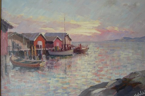Ubekendt kunstner (20 årh): Fiskerhuse, Bohuslän i Sverige. Olie på lærred - nyrenset. Sign.: Utydelig signeret. 45x66 (62x82) Et virkeligt dejligt og gennemarbejdet maleri med et smukt lyserødt lys