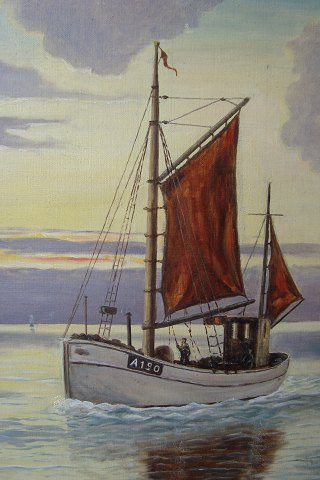 Ubekendt kunstner (20 årh): Fiskekutter A120 ved solopgang 1966. Olie på lærred. Sign.: Gotfred R: 66. 50x40 (63x53)