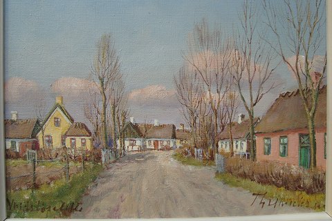 Theodor Ulrichsen (1905-70): Landsbygade fra Vrisdløselille. Olie på lærred. Sign.: Th. Ulrichsen 27x35 (44x52) Ulrichsen var uddannet fra Teknisk skole og Kunstakademiet - senere vejledt af L.A. Ring.