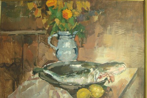 Nature Morte med torsk, blomster i vase og citroner på bord.