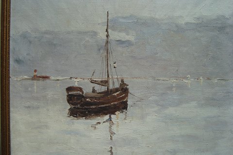 Ubekendt kunstner (20 årh): Fiskekutter ved havblik 1949. Olie på lærred. Utydelig sign.: Jørgen S.....??? - 49.(Én af mig ubekendt signatur). 50x62 (57x69) Et virkeligt dejligt og spændende maleri.