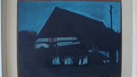 Ubekendt kunstner (20 årh): Hus i blå skumring 1958. Pastel mv på papir. Sign.: Utydelig signeret (en for mig ubekendt signatur)1958. Indrammet uden glas. Spændende billede. 43x55 (60x72)