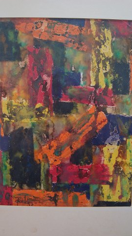 Ubekendt kunstner (20 årh): Abstraktion 1957. Tempera på papir. Sign.: JRE (monogram)(???)(bly)(én for mig ubekendt signatur - kan nogen hjælpe?) 29x21 (46x36)