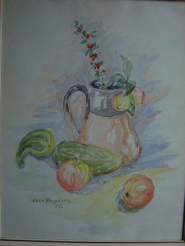 Ebba Langballe (20 årh): Opstilling med kande, frugt og græskar 1954. Akvarel på papir. Sign.: Ebba Langballe 54. 52x40 (55x43)