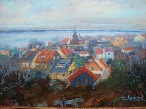 Alex Hansen (født 1947): Vue ud over by. Olie på lærred. Indrammet i lækker guldramme. Sign.: A. Hansen. 40x50 (52x62)