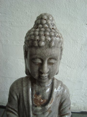 Gammel kinesisk Buddha på lotustrone. Terracotta. Krakelé glasur i grå/celadon. Ming Stil Højde - 42 cm.