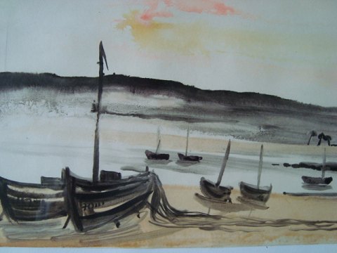 Ubekendt kunstner (20 årh): Kystparti med fiskerbåde. Akvarel på papir. Usigneret. Bagpå betegnet/signeret - Sjøbæk 23x32 (40x46)