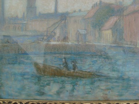Ubekendt kunstner (20 årh): Havneparti fra København? pastel på papir. Usigneret. Indrammet i meget smuk, gammel og tung guldramme. 35x46 (49x60)