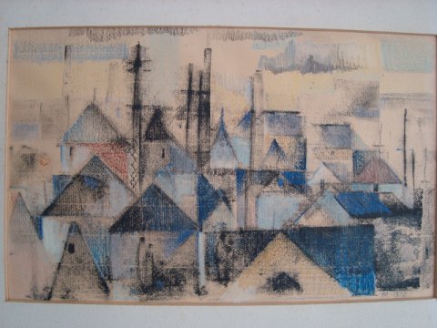 Poul Møller (20 årh): Vue udover hustage og master 1972. Pastel på papir. Sign.: PM 1972 (bly) Snavset passepartout - indrammet uden glas. 25x38 (35x54)