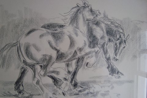 Lise Færch (1918-99): Komposition med heste 1982. Litografi på papir. Sign.: Lise Færch 82 (i stenen) Glasset er revnet. Indrammet 41x51