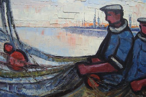 Roald Hansen (1938-2018): Fiskere røgter garn. Olie på lærred. Sign.: Roald Hansen Et maleri stærkt inspireret af Anker Landberg. Indrammet i sølv svæve ramme. 42x84 (46x88)