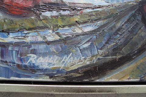 Roald Hansen (1938-2018): Fiskere røgter garn. Olie på lærred. Sign.: Roald Hansen Et maleri stærkt inspireret af Anker Landberg. Indrammet i sølv svæve ramme. 42x84 (46x88)