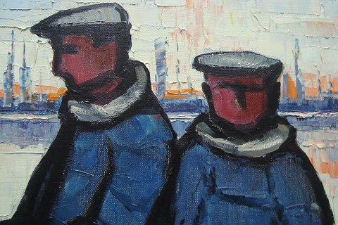 Roald Hansen (1938-2018): Fiskere røgter garn. Olie på lærred. Sign.: Roald Hansen Et maleri stærkt inspireret af Anker Landberg. Indrammet i sølv svæve ramme. 42x84 (46x88)