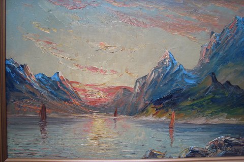 Gustav P. Rimmer (1904-88): Fjordparti med skibe og bjerge - solnedgang - antagelig Norge. Olie på lærred. Sign.: G.P. Rimmer. 32x47 (41x56)