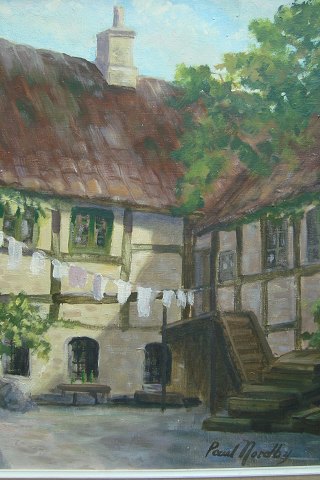 Paul Nordby (20 årh): Gårdeksteriør. Olie på lærred. Sign.: Paul Nordby 51x41 (60x50)