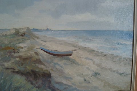 Evelyn Thorbjørn (1911-90): Strandparti fra Skagen med optrukne fiskerbåde. Olie på lærred. Nyrenset Sign.: E. Thorbjørn, Skagen. Bagpå blindramme - No. 66. 33x47 (50x64)