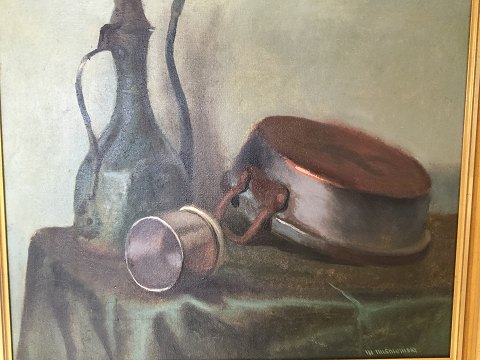Witold Wisniewski (1921-77): Opstilling med kobbertøj på bord. Olie på lærred. Sign.: W. Wisniewski. Bagpå navn - Witold Wisniewski og Warszawa samt diverse stempler. 50x61 (61x72)