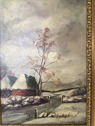 Sigrid Bech-Knudsen (1864-1948): Vinterparti med huse ved vej. Olie på lærred. Sign.: Sigrid Bech Knudsen. 44x30 (55x42)