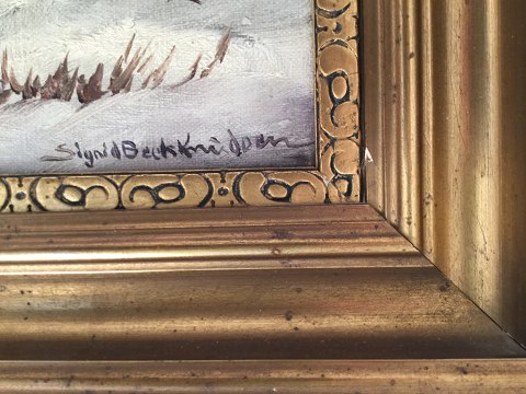 Sigrid Bech-Knudsen (1864-1948): Vinterparti med huse ved vej. Olie på lærred. Sign.: Sigrid Bech Knudsen. 44x30 (55x42)