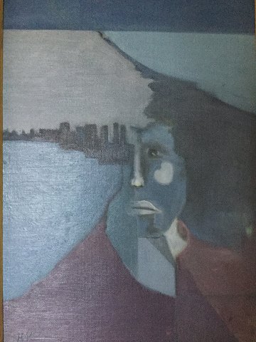 Hans Kjær (født 1943): Komposition med ansigt. Akryl på plade. Sign.: HK Bagpå "Hans Kjær" 62x43 (64x45)