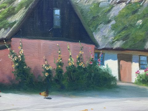 Osvald Karms (1885-1972): Landsbygade med stokroser og høns. Olie på lærred. Sign.: O. Karms 54x65 (68x79)
