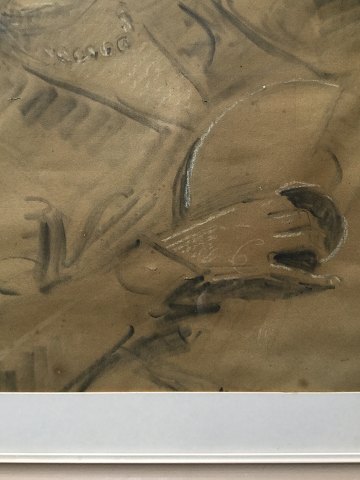 Hans Jørgen Korn (1888-1963): Guitarspillende kvinde. Oliekridt og kul på papir. Sign.: Korn. Små rifter i papiret (se fotos) 51x41 (64x54)
