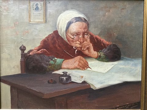Oluf Simony Jensen (1864-1923): Gammel kone skriver brev i stuen.. Olie på lærred. Sign.: Simony Jensen 30x38 (39x47)