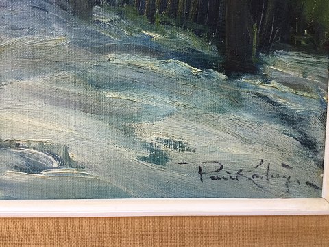 Poul Kastrup (1920-87): Vinterparti med personer ved mølle. Olie på lærred. Sign.: Poul Kastrup 36x46 (58x68)