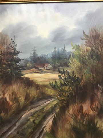 Ubekendt kunstner (20 årh): Vej gennem landskab ved Store Restup 1968. Olie på lærred. Sign.: P. Sun... 68. Betegnet - St. Restrup. 66x56 (82x72)