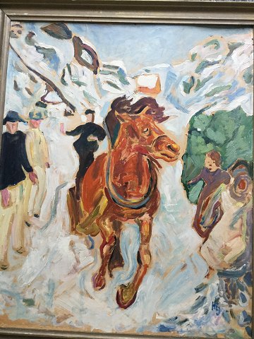 Herman Emil Jensen (født 1913): Galoperede hest gennem menneskemængde. Olie på plade. Sign.: HEJ Bagpå - Herman Emil Jensen 61x50 (68x57) 13003