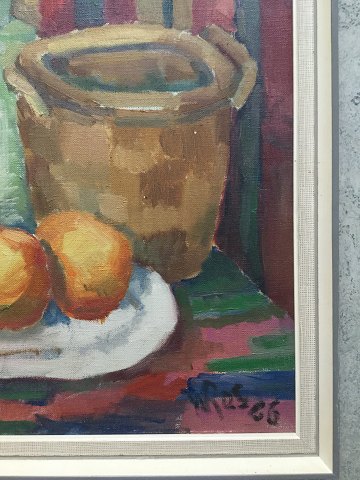 William Rasmussen (1907-82): Opstilling på bord med flasker, frugt mv. 1966. Olie op lærred. Sign. WRas. - 66. 55x46 (61x52)