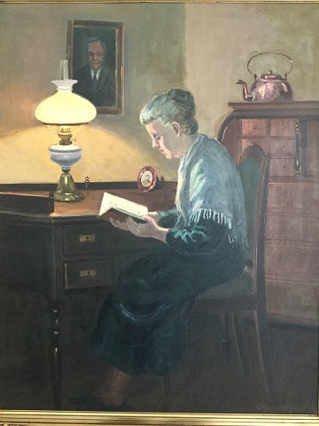 Kunstnerens hustru Christa Søndergaard læser i bog i lampens skær.
