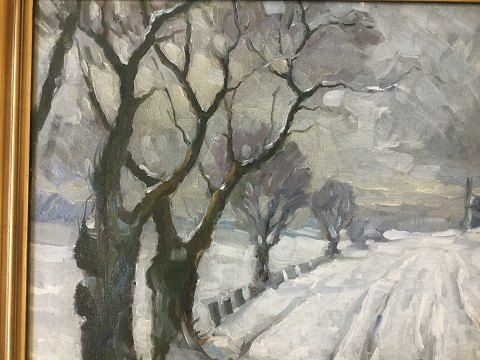 Jens Sinding Christensen (1888-1980): Vej med mølle og nøgne træer, vinter. Olie på lærred. Nyrenset Sign.: JSC (Monogram) 50x58 (61x70)