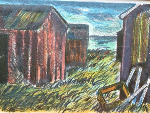 Poul Sørensen (1931-2018): Fiskerhuse ved havet. Farvelitografi på papir. Sign.: Poul Sørensen (bly) Nummer 131/200 40x30 (32x38) Poul Sørensen er uddannet fra Teknisk Skole i Frederikshavn.