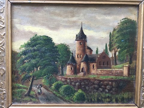 Ubekendt kunstner (19 årh): Person på vej ved kirke eller borg. Olie på plade. Usigneret. 23x27 (34x39)