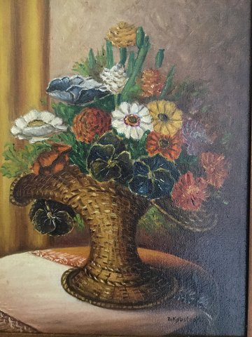 Th. Købsted (19/20 årh): Blomsterbuket i kurv 1915. Olie på lærred. Nyrenset. Sign.: Th. Købsted - 15. 44x33 (55x44)