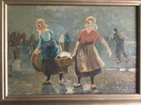 Ubekendt kunstner (20 årh): Kvinder samler østers i Bretagne. Olie på malerpap. Sign.: Usigneret 21x29 (28x37)