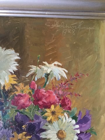 Svend Melchior-Hansen (1908-77): Opstilling med kobberbæger med blomster samt messingdåse 1958. Olie på plade. Sign.: S. Melchior Hansen 1958. Indrammet i smuk sølvramme. 50x35 (59x44)