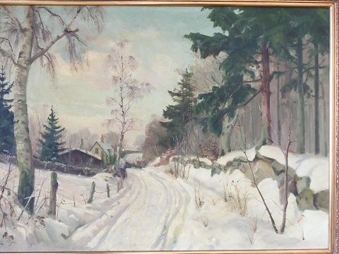 Harald Pryn (1891-1968): Vinterparti fra Hareskoven. Olie på lærred. Bagpå betegnet - Skovbrynet Hareskov" Sign.: Harald Pryn 50x70 (67x87)