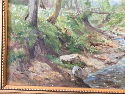 Harald Pryn (1891-1968): Skovparti med rindende å. Olie på lærred. Sign.: Harald Pryn 50x70 (65x85)