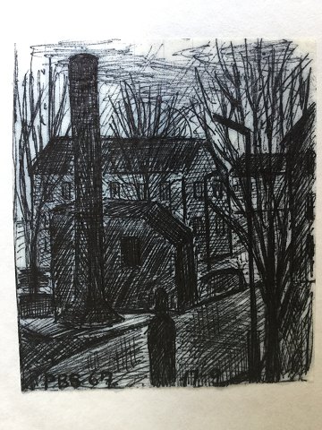 Peder Brøndum Sørensen (1931-2001): Huse og varmecentral 1967. Tusch på papir monteret på større ark 20x15. Sign.: PBS 67 17-9 Uden ramme. 11x10