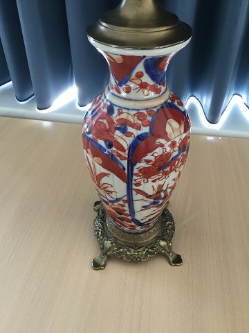 Gammel japanske vase omlavet til lampe. Polykrom bemalet antik porcelæns vase fra Japan. Monteret i nyere tid med messing firepas fod og top. Højde excl. fatning - 29 cm.