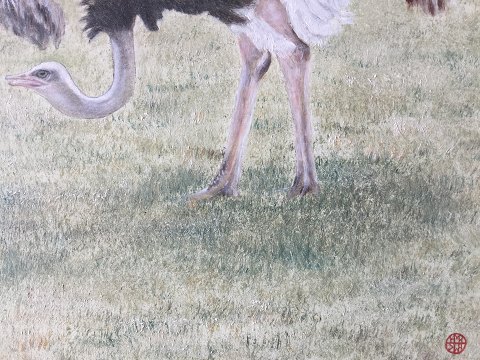 Hugo Møller Knudsen (født 1949): 2 Strudse i Aalborg Zoologiske Have. Olie på plade Sign.: HMK (monogram) Bagpå - "Struds: Aalborg Zoo- H. Møller Knudsen" 38x46 (40x48)