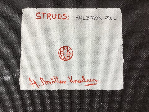Hugo Møller Knudsen (født 1949): 2 Strudse i Aalborg Zoologiske Have. Olie på plade Sign.: HMK (monogram) Bagpå - "Struds: Aalborg Zoo- H. Møller Knudsen" 38x46 (40x48)
