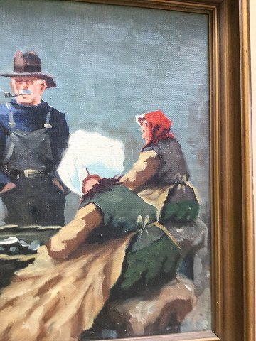 Christian Kjær Mortensen (født 1908): "Fisker og fiskerkoner på Gammel Strand" Olie på lærred. Sign.: Chr.M. 40x32 (47x39)