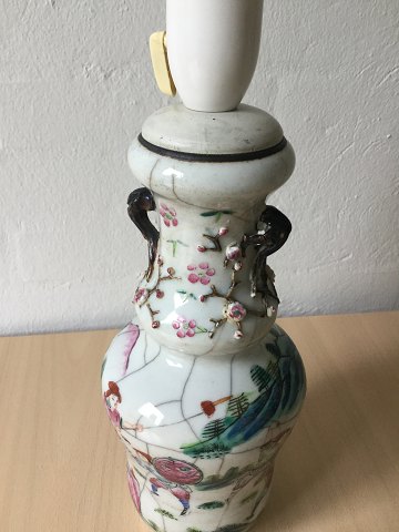 Porcelæn med kracelé glasur og polykrom dekoration i form af personer i landskab.