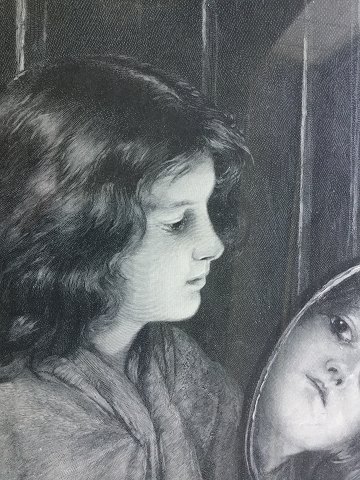 H. Gedan (19 årh): Pige der spejler sig. Træsnit på papir. År 1900. Sign.: H. Gedan x.I. Indrammet med defekt glas. 32x23 (36x29)