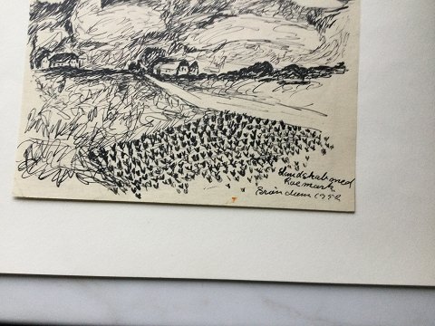 Peder Brøndum Sørensen (1931-2001): Landskab med Roemark 1952. Tusch på papir monteret på større ark (21x30) Sign.: Brøndum 1952. Betegnet - Landskab med Roemark. Uden ramme. 13x19