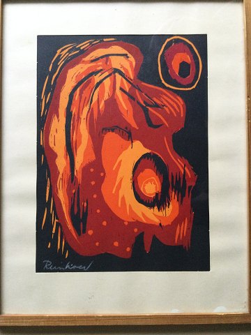 Træsnit II: Abstraktion i orange, rødt og sort.