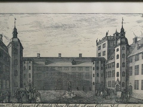 Ubekendt kunstner (20 årh): "Den 17de Maj klokken 7 eft. trædde Hans Majestæt af paa Colding Slot". Litografisk tryk efter tegning af Poul Isac Grønvold (1718-60). Indrammet 31x41.